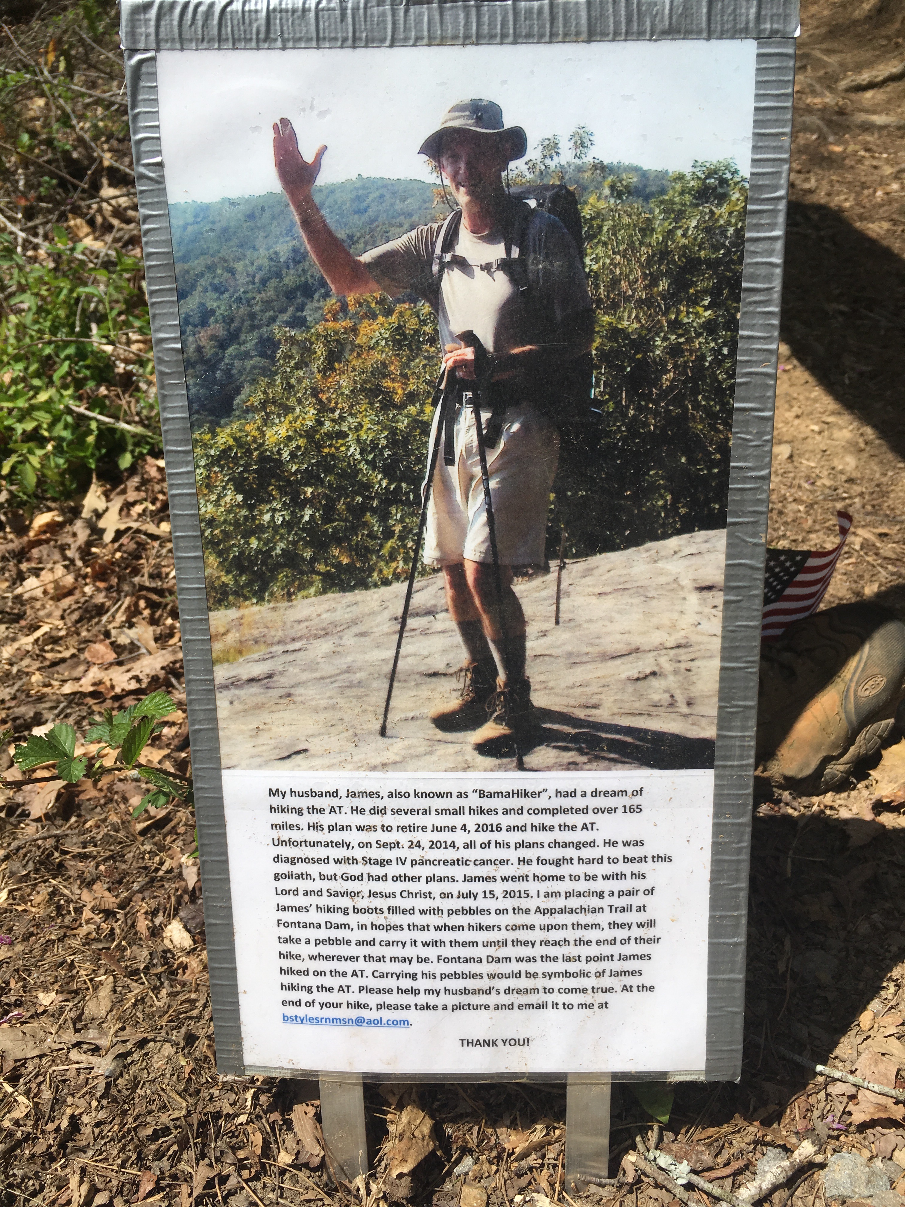 The note asked hikers to carry a pebble for her husband James to the end of their hike and send a picture to her. Her husband loved the AT and had done a few sections but planned to through hike in 2016 after he retired but was diagnosed with cancer in 2014 and passed away in 2015.