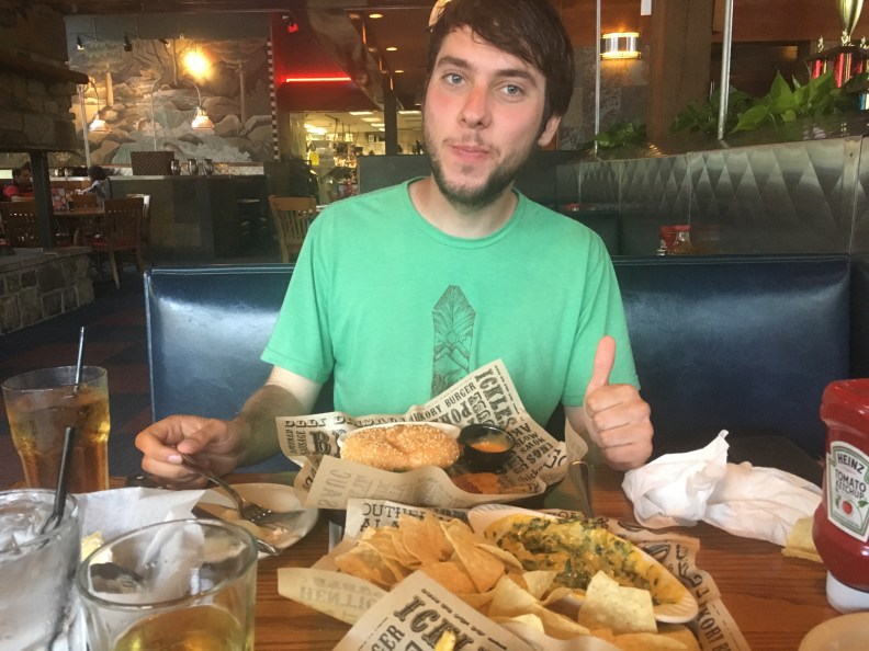 Pete and I got my mail drop and a free shower and headed for a nice meal… I ordered of course a burger and fries.