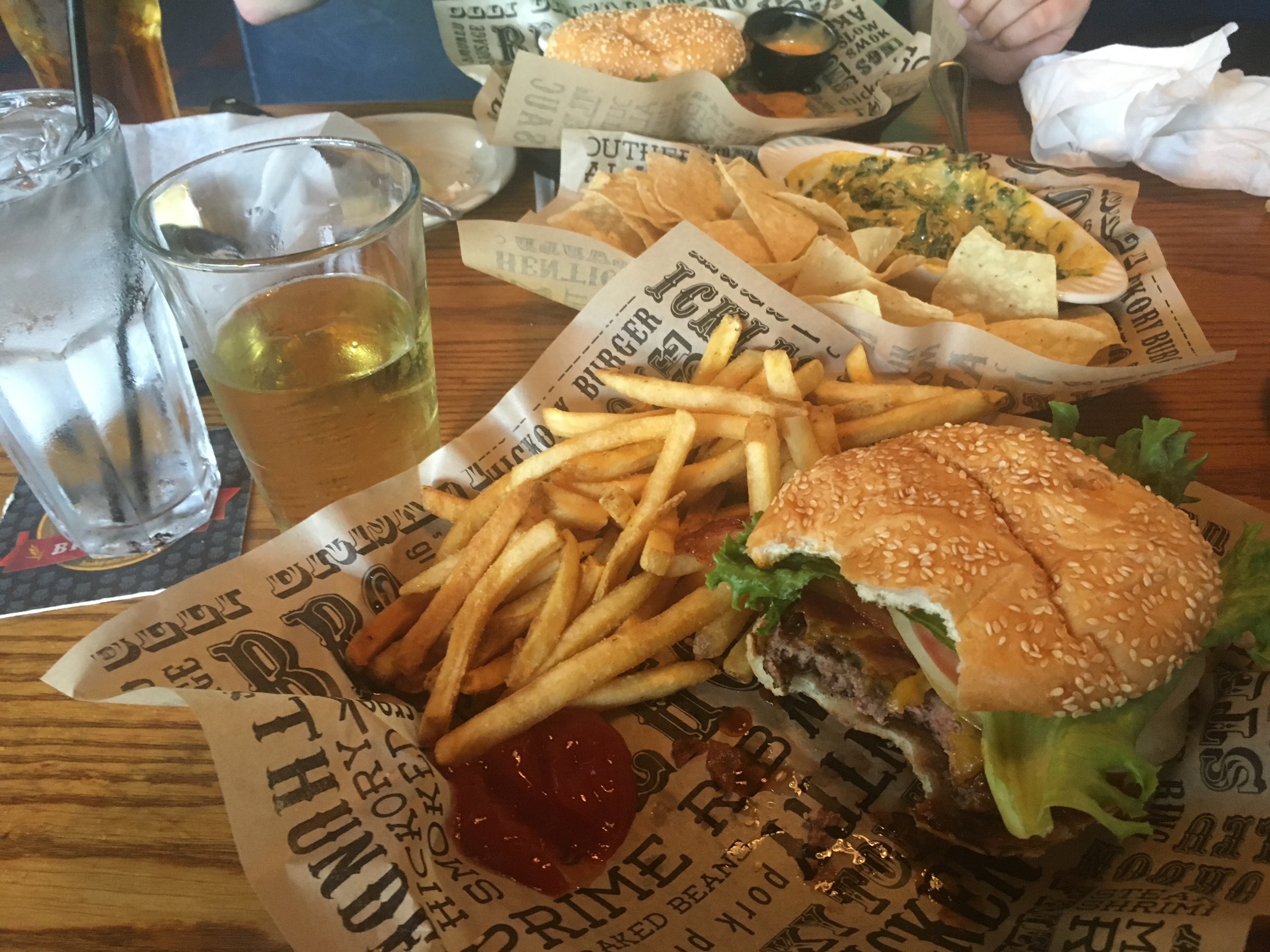 Pete and I got my mail drop and a free shower and headed for a nice meal… I ordered of course a burger and fries.