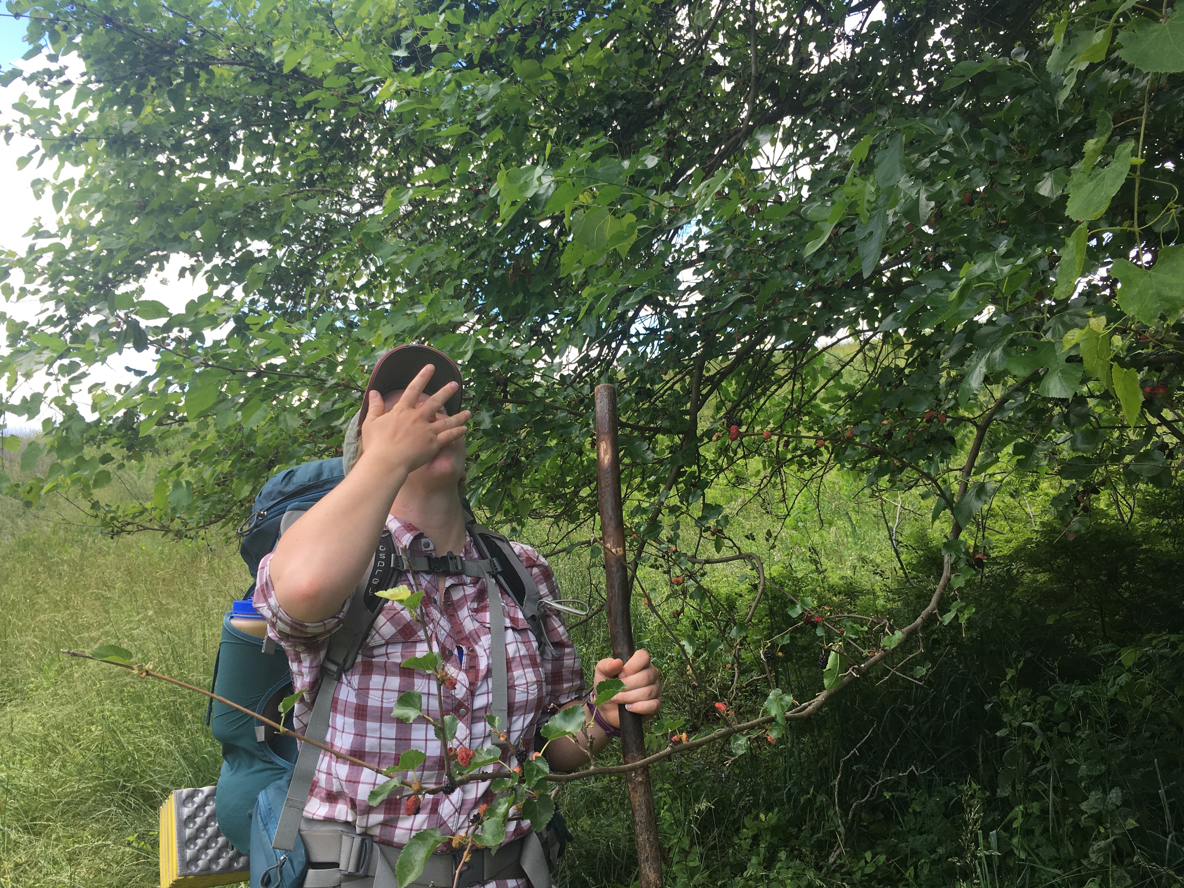 Planner knows quite a bit about plants. She saw a mulberry tree and went berserk picking them off and popping them in her mouth.