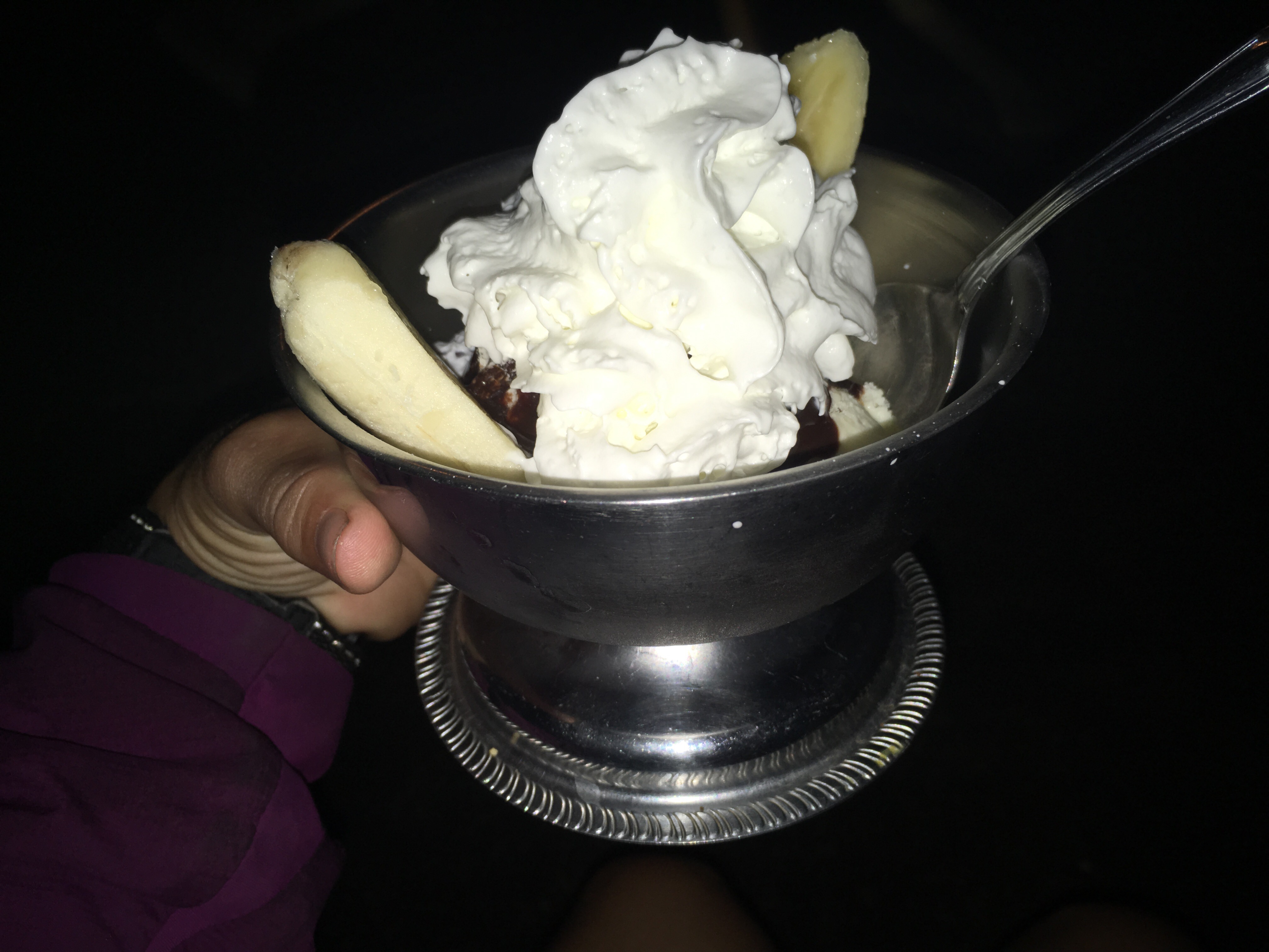 So when we finally got back he went inside to get us ice cream. We thought it would just be a couple scoops but instead he made a whole sundae in some fancy bowls.