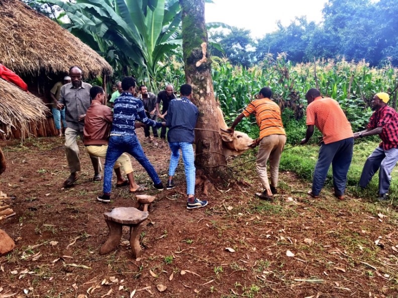 After the first one was killed, a group of younger men and kids told me to follow them (Izzy come on! Hurry!) to watch the next one down the road. We briskly walked down the path to the next house. The cow here though was HUGE and put up a hell of a fight. I literally started to get worried that they weren’t going to be able to get him down, as I took a few steps backwards. but more men jumps in and finally brought him down.