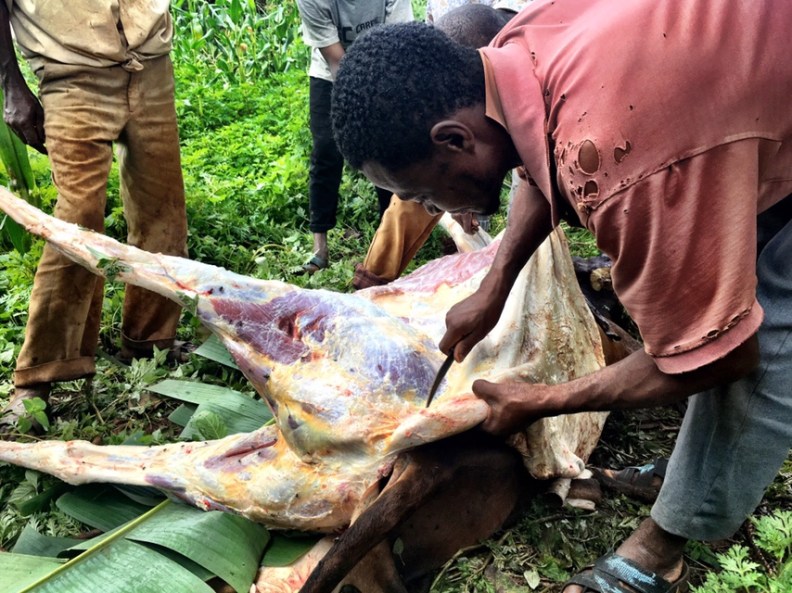 After that one, I said I had seen enough of the killing of cows and was ready to head back to the compound. In doing so I decided to plant a chair in the back yard and watch the men divvy up the meat and also…eat the fresh raw meat.