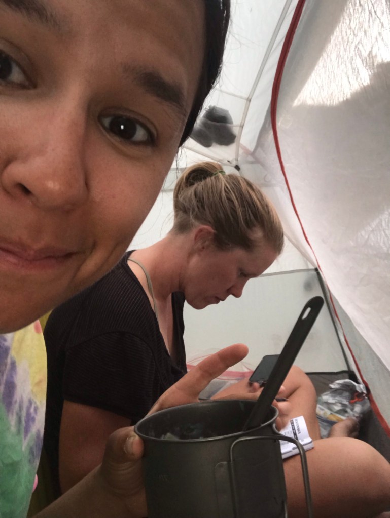 We are exhausteddd but excited to hit the hot spring first thing in the morning! Our camp spot also had a ton of mosquitos so for dinner Planner and I had to hang out in my enclosed one person tent. 😂