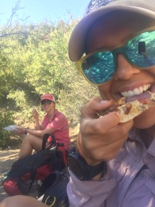Surprisingly I was still in good spirits as the trail had us staring into the gorgeous mountains ahead of us and we were able to have some breakfast pizza. 😁