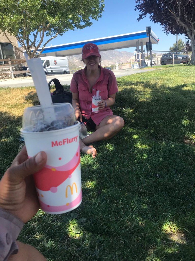 Planner and I and a couple others were the first to arrive around 11 am and we ordered us some McFlurrys and found a nice shady spot outside between the McDonald’s and gas station. Nothing is better than ice cream on a hot day. Yummmmmm.