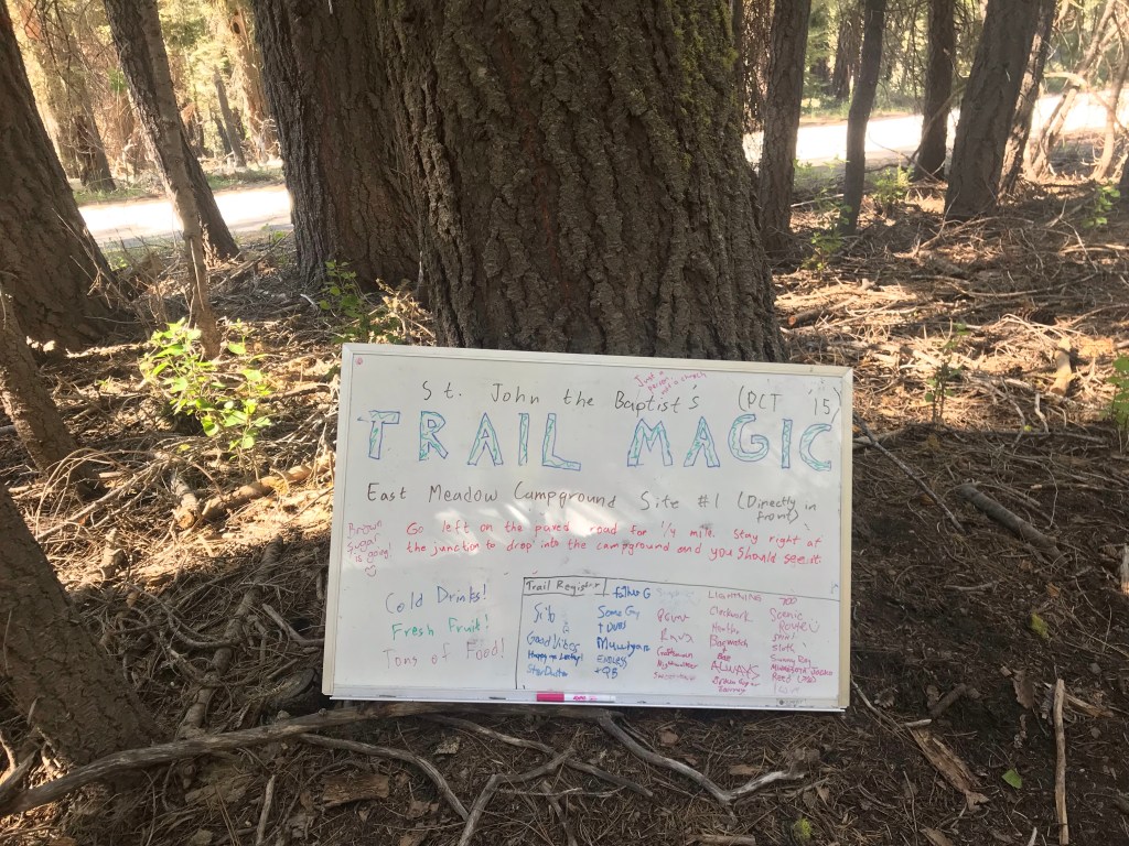 We had plans to continue on for 10 more miles afterwards. We hiked for about 4 miles and ran across a sign that mentioned trail magic and who had previously been there.