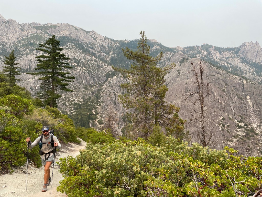 While working on the uphill climb, it brought us out onto a beautiful ledge with smoky views. It felt weird to think it looked pretty even with the smoke but also sad because we knew that smoke was probably from the roaring Dixie fire that had started right behind us in Belden.