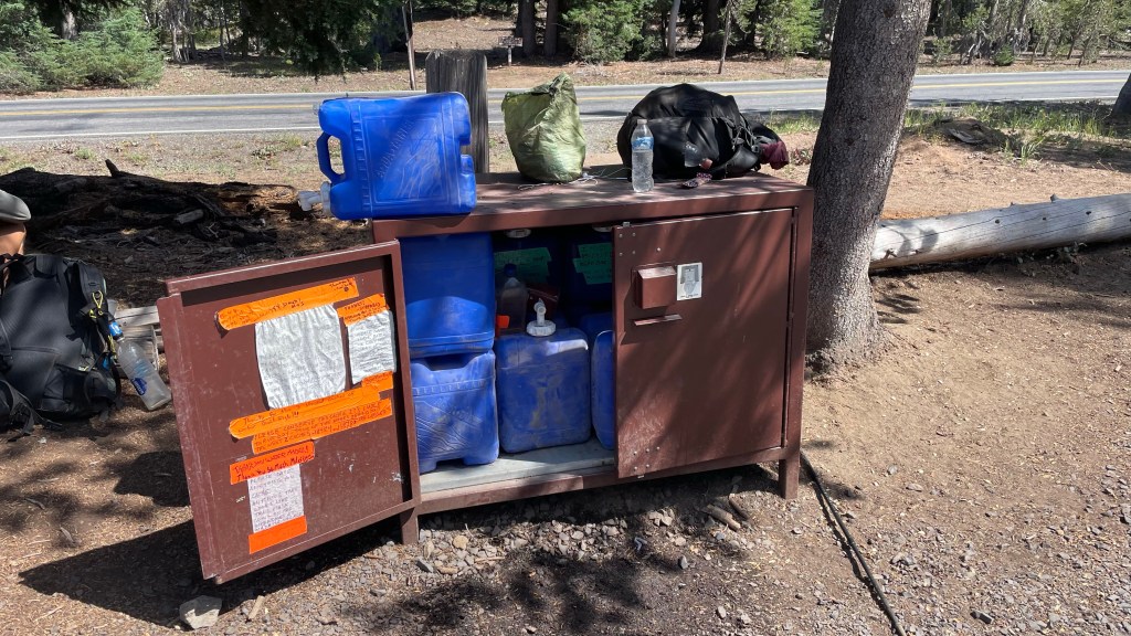 We hiked on for 9 miles and rejoined with the PCT around 2 pm. Where the trail rejoined, we were able to fill up our water on a water cache. It was wild to be next to such a big lake and then be in such a dry area elsewhere. Once again, we were eternally grateful for the people who provide these caches. Such a life saver!