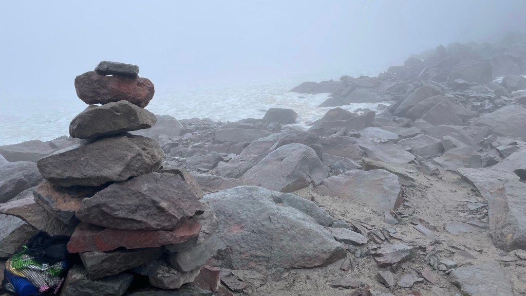 We started out around 7 am in the cold misty fog. The trail came out onto a ridge line where the trail markers became these big rock cairns to follow.