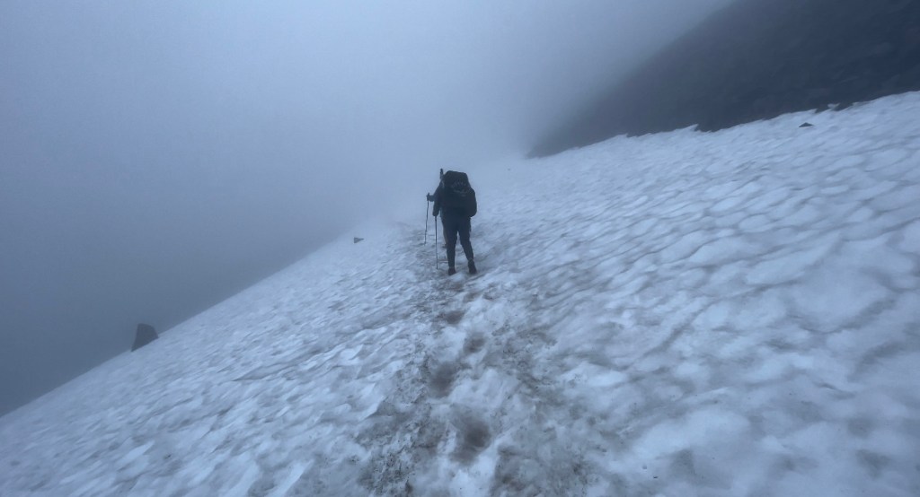 As I continued the climb up to what was known as the Knifes Edge, I spotted Planner waiting by a rock cairn and a massive pile of snow behind her.