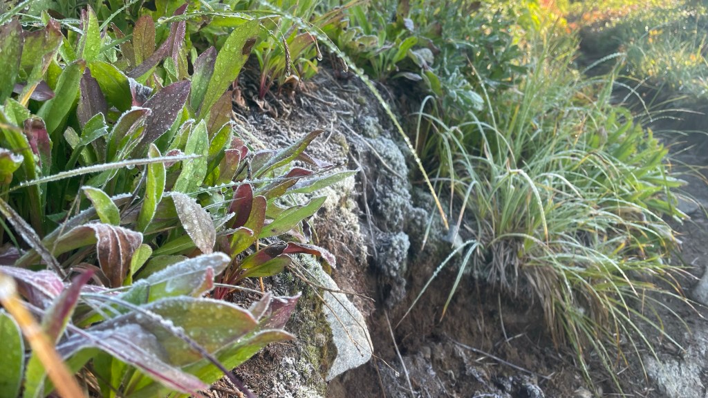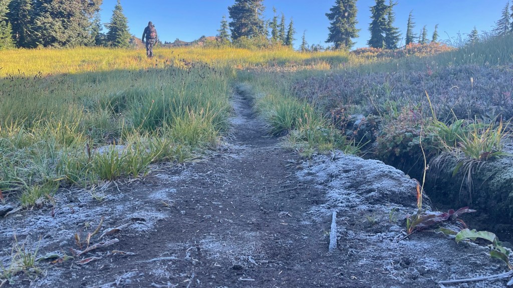 Once we got high enough in the climb we started to see frost covering the trail and bushes. I was so happy we didn’t have to deal with any of that at our camp spot.