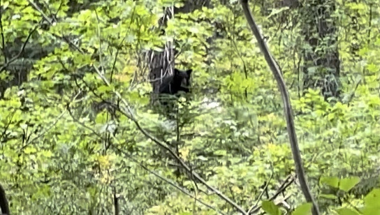 In the afternoon I heard loud branches being snapped off to my left and spotted a black bear. I immediately stopped to watch him. He looked up and stared at us for a second and then turned around and darted down the mountain. He was adorable. I wish we could pet them!