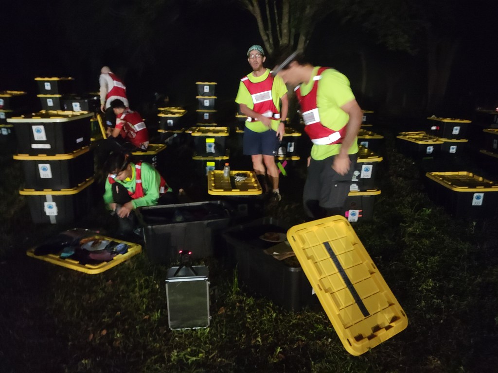 We continued into the night and found ourselves pedaling through sand and then out on mountain bike trails. Sometimes it felt like we were cycling on a loop, twisting through the trees over and over again. We struggled to find checkpoints as we didn’t have any way to measure distance. We ended this first bike portion with only 1 additional checkpoint and our spirits were low. What did we get ourselves into? We arrived at our first Transition Area that had our totes so we could change into fresh clothes and eat some real food the volunteers had made.