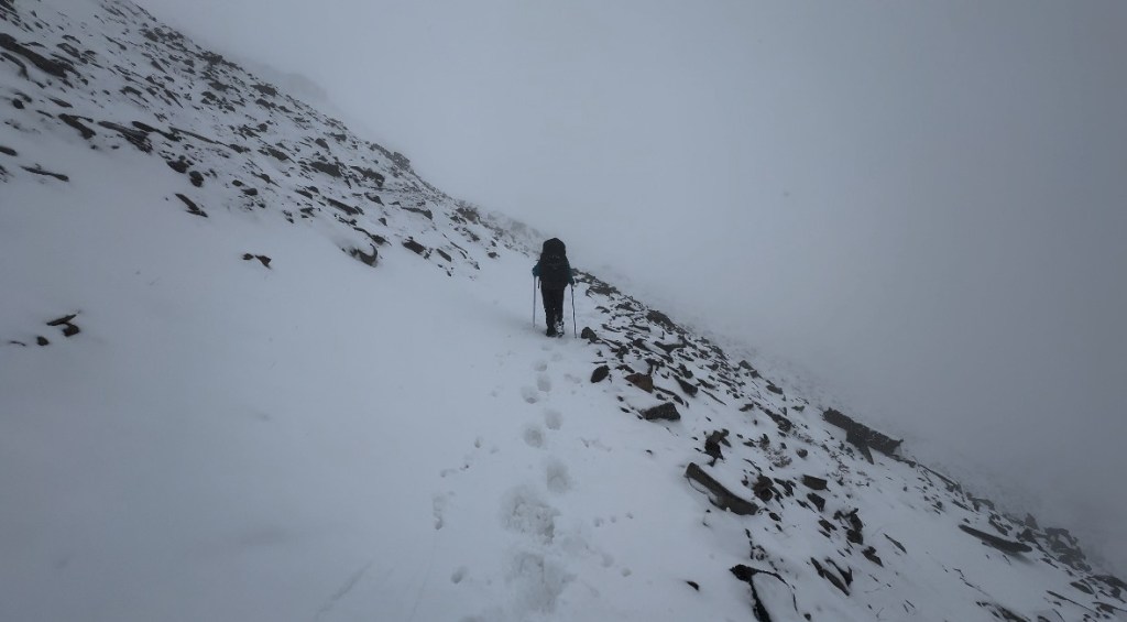 We continued the long climb up and found ourselves in a winter bubble. Thick snow, low clouds, that made it hard to see anything, and snowflakes falling down on us. It was white everywhere and we couldn’t tell how much of the climb we had to go.