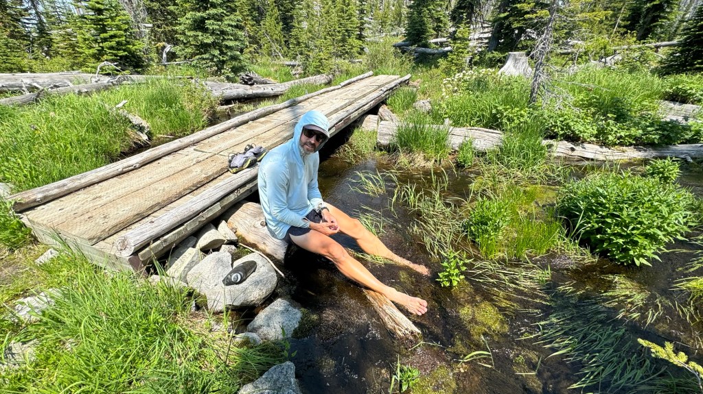 We walked down to an ice cold spring and saw Karma who was waiting for his partner. Journey soaked his shirt and then at the following creek I did the same. Journey also decided to soak his legs and cool off as much as he could.