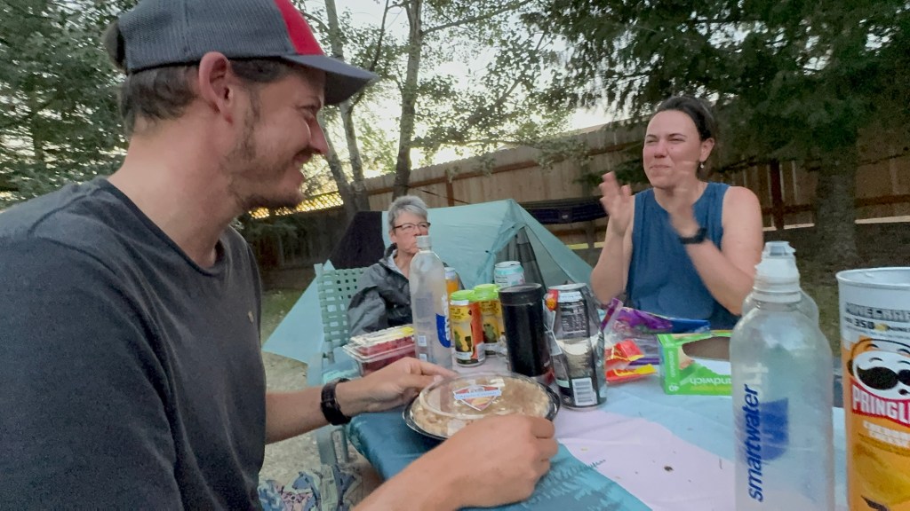 We took food back to the campground and met another hiker named Raspberry. Us 6 sat around and enjoyed dinner and each others company. It was also Karma’s birthday today which was fun to celebrate with some apple pie they shared. Fun fact, Journey and I are the only Americans in the group! Akela and Karma are from Belgium. Lumberjack from Germany and Raspberry from Switzerland.