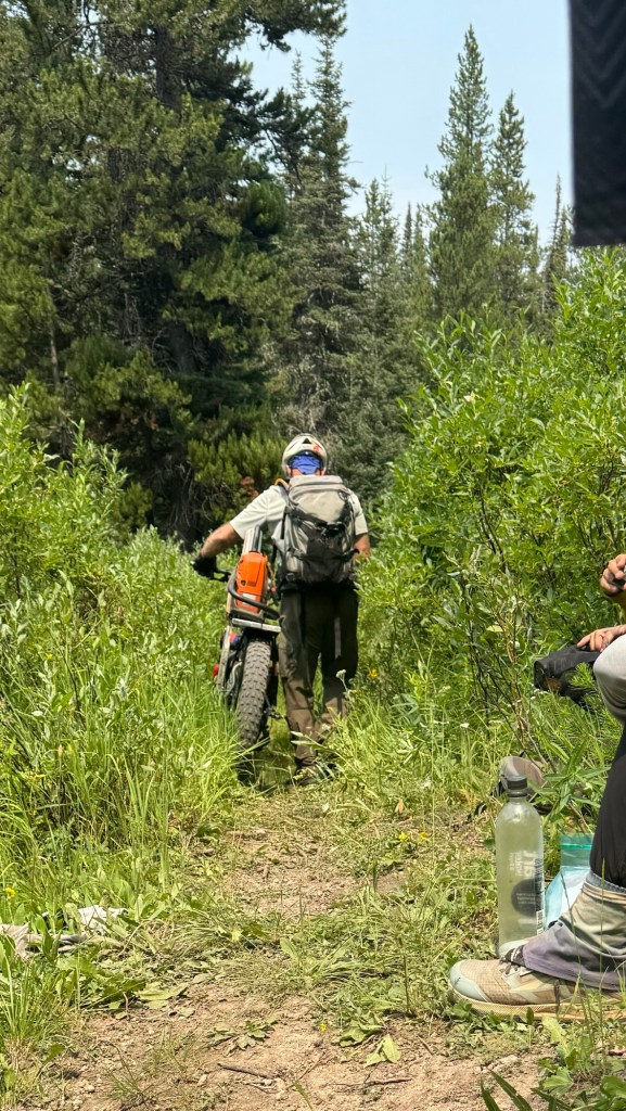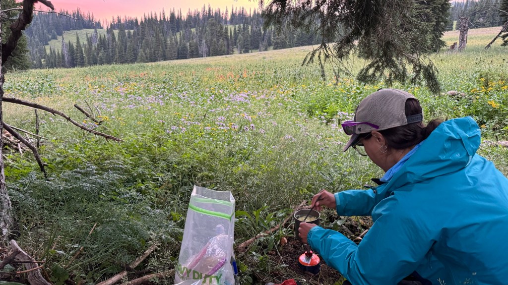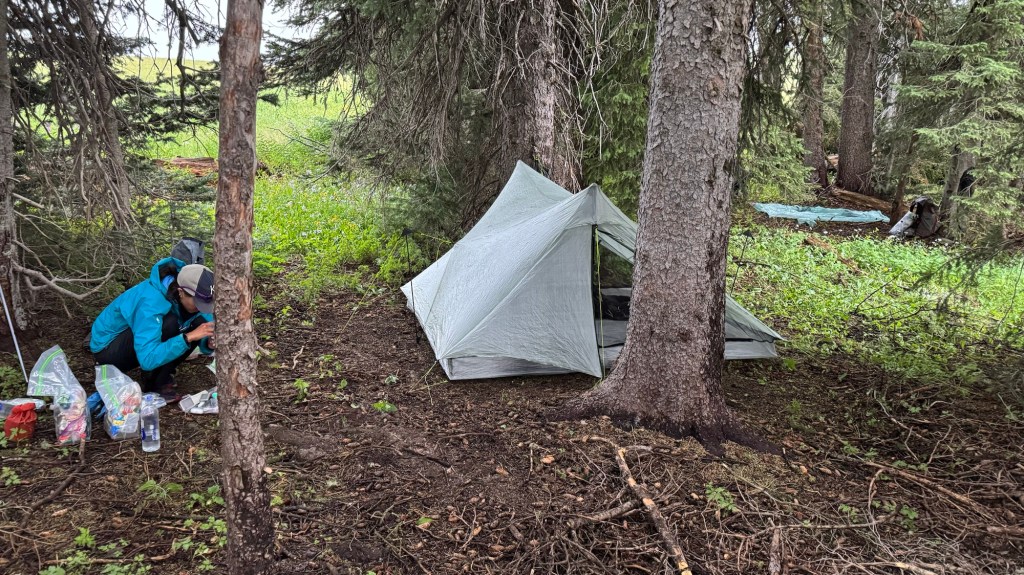 We slept in this morning with the cool air and a not so restful night. Around midnight, Journey and I both heard splashing around in the pond near us and woke up immediately. We couldn’t tell what kind of animal it was and when we turned our headlamps on, it wouldn’t shine far enough. Whatever it was, we could hear it walking around doing its thing, splashing about. We assumed either moose or elk possibly bear? Not too sure of all their behaviors.