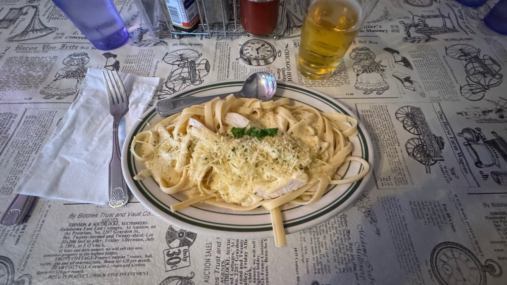 Around 7:30 we headed to the only restaurant in town that was open, Connie’s and I ordered a chicken and noodle type of dish. It was comfort food and I ate it within a flash.