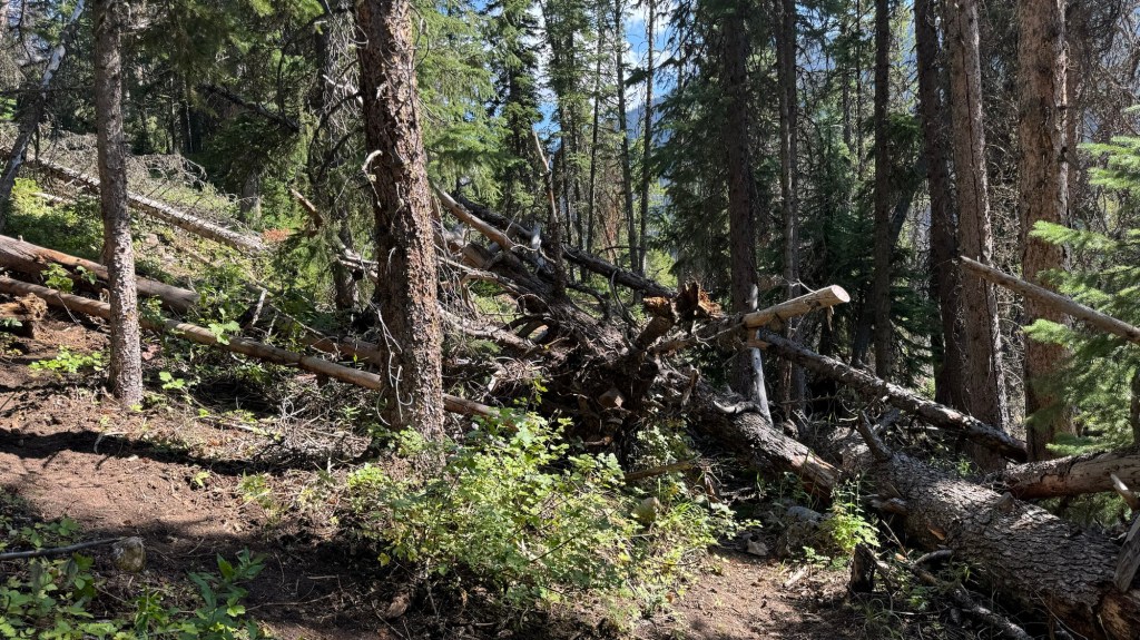 We finished the day with hiking up to a lake and struggled to find a campsite with Captain. Initially we found some spots but realized they were surrounded by dead trees and we were not fans, especially as Captain had a dead tree fall right along trail today without any wind. 🫣 Journey and I were not far behind but heard the tree come crashing down. This made all of us not want to camp anywhere near these dead trees.