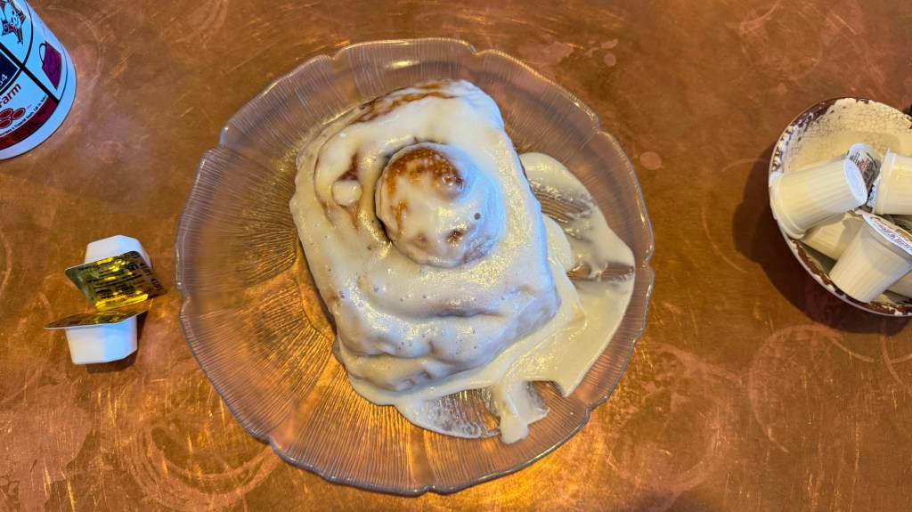 I give the cinnamon roll a 7 out of 10 stars. The icing was a bit much but the roll itself was quite delicious. I would probably place this at third with Augusta still in first. I don’t think it will be beat unless I find another made from scratch!