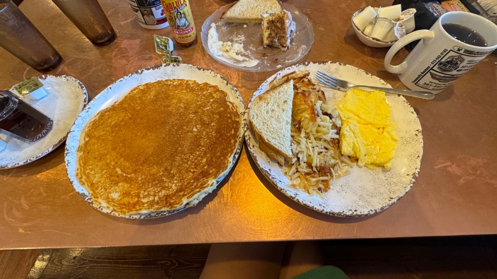 Once we got around we headed next door to a restaurant called Oxbow for breakfast. I ordered pancakes, eggs, hash browns, and a cinnamon roll. Finally! It feels like it’s been a while since I have been able to find one!