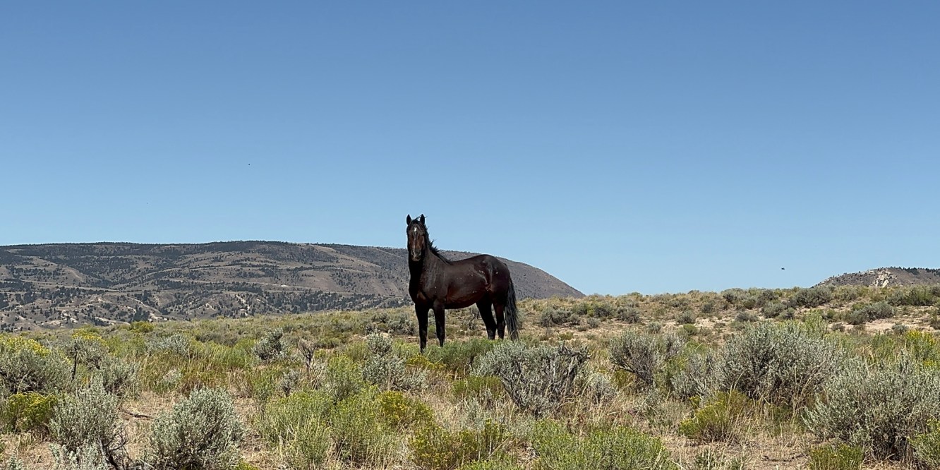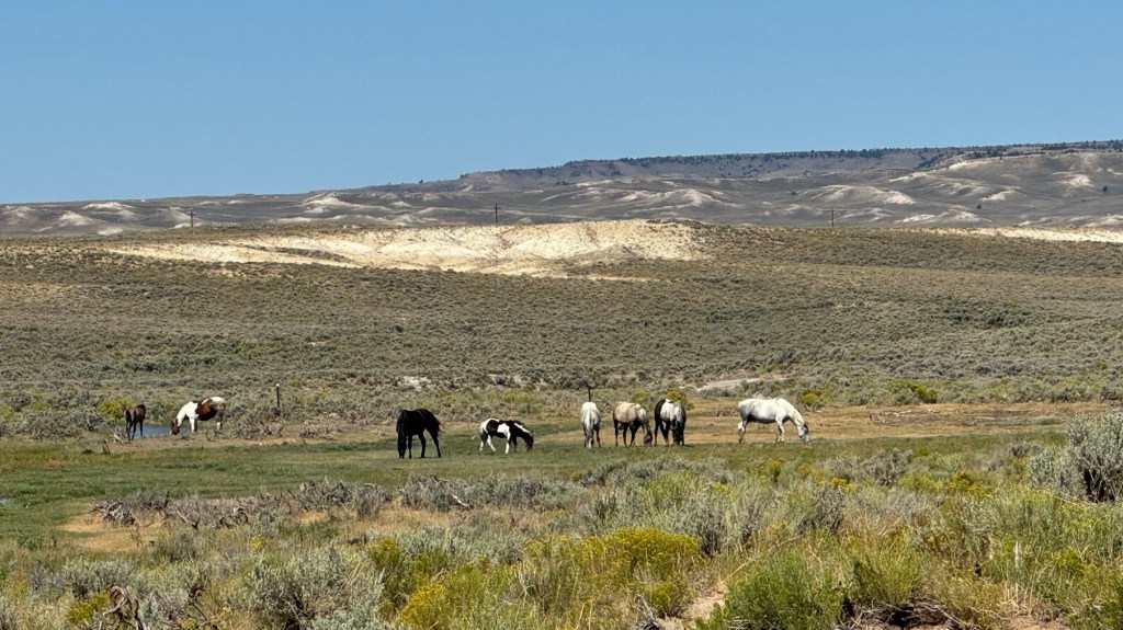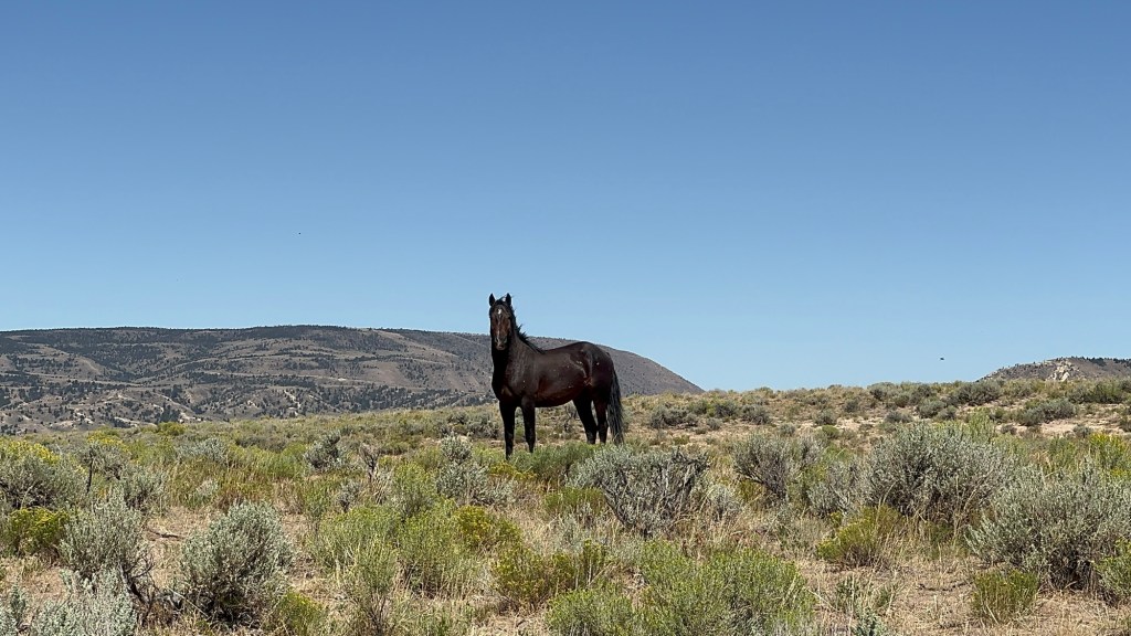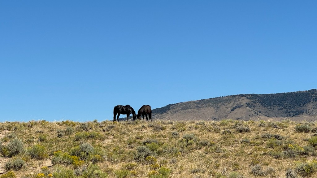 As we are sitting there refilling our bottles a bunch of wild horses come running down the side. I stood and watched them and then as I sat back down, I heard a noise coming from behind me and another horse is sprinting towards the group of horses but one of the group horses then runs towards it.