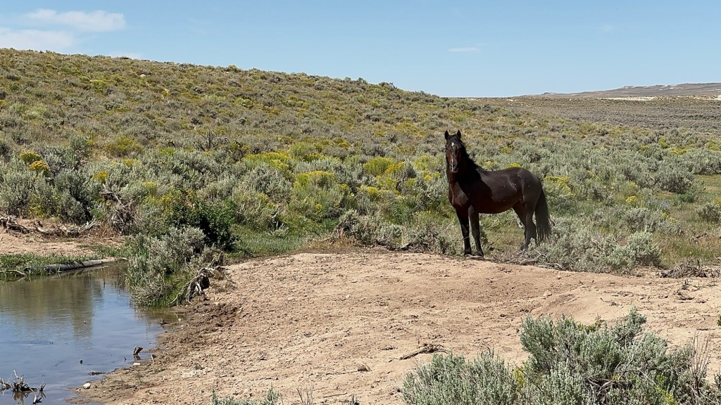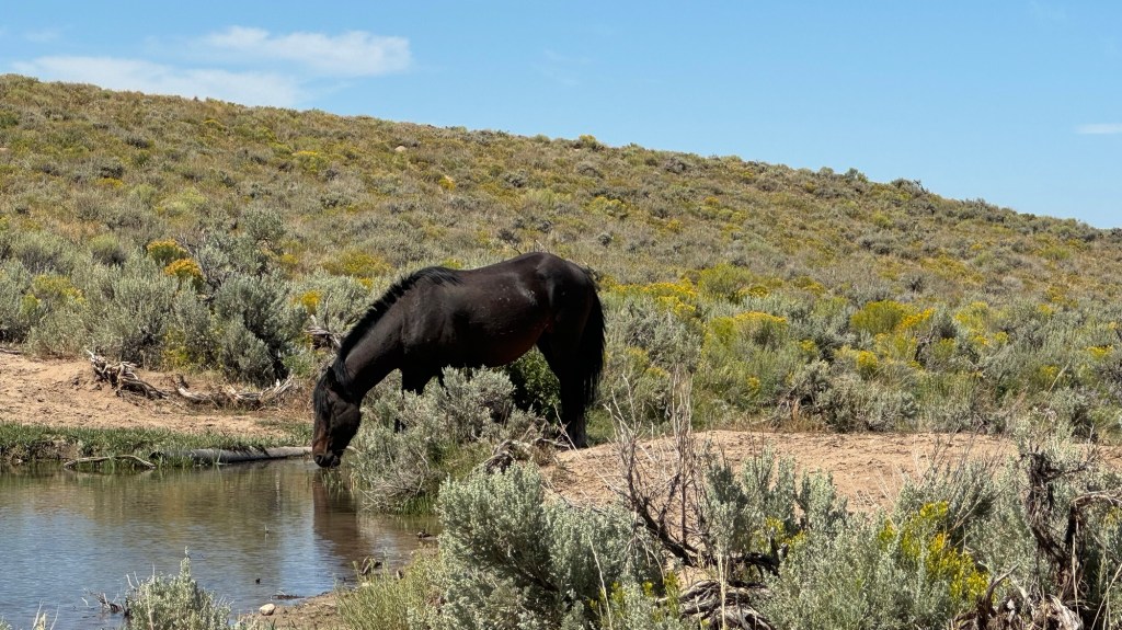 Then the horse that belongs to the group goes back and the one outsider gets closer and closer to us, it was thirsty. I tried to talk calmly to it, letting it know it’s okay to come and drink and eventually it does.