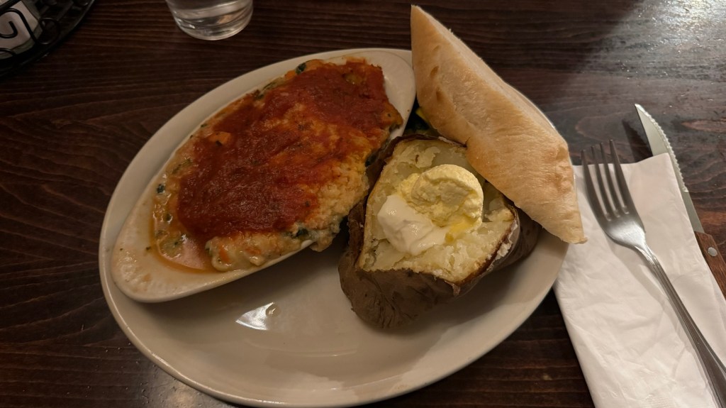 Since it was already 5 PM by the time we arrived, we decided to do a quick load of laundry and went to eat at Quincy’s steakhouse. I wasn’t fancying a steak but ordered vegetable lasagna, salad, potato, and bread.
