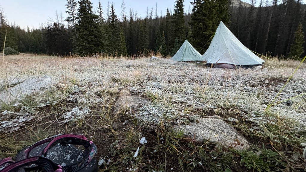 We woke up with the outside of our sleeping bags soaked and frost covering the inside and outside of our tent. As I peered under our closed vestibule I could see frost covering the grass and everything around.