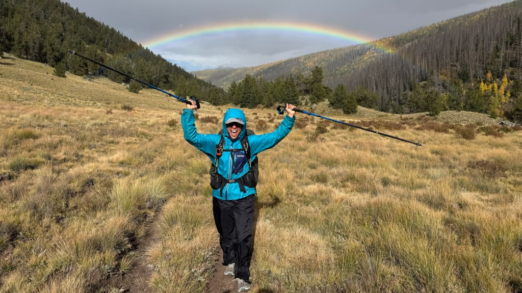 The rain came back and we eventually put back on our rain gear and continued. It was nonstop day of rain gear on and off again. Around 4:20 the rain had just lightened up and I turned around to Aster looking at the sky and a giant rainbow above her.