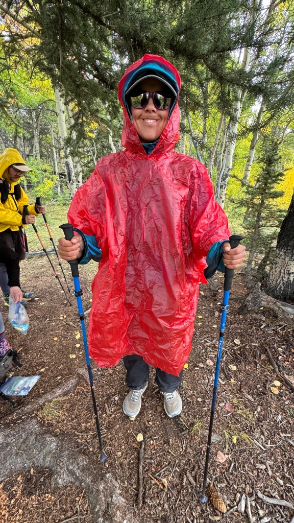 Around 11 we made it to a water source 12 miles in when the rain started coming down. We were huddled under a tree taking a short break and I decided it was time to bust out the big, red poncho and see how it would work. It was quite hilarious how huge it was over me and if Whatever and I were side by side in our rain gear we looked like ketchup and mustard. 😂