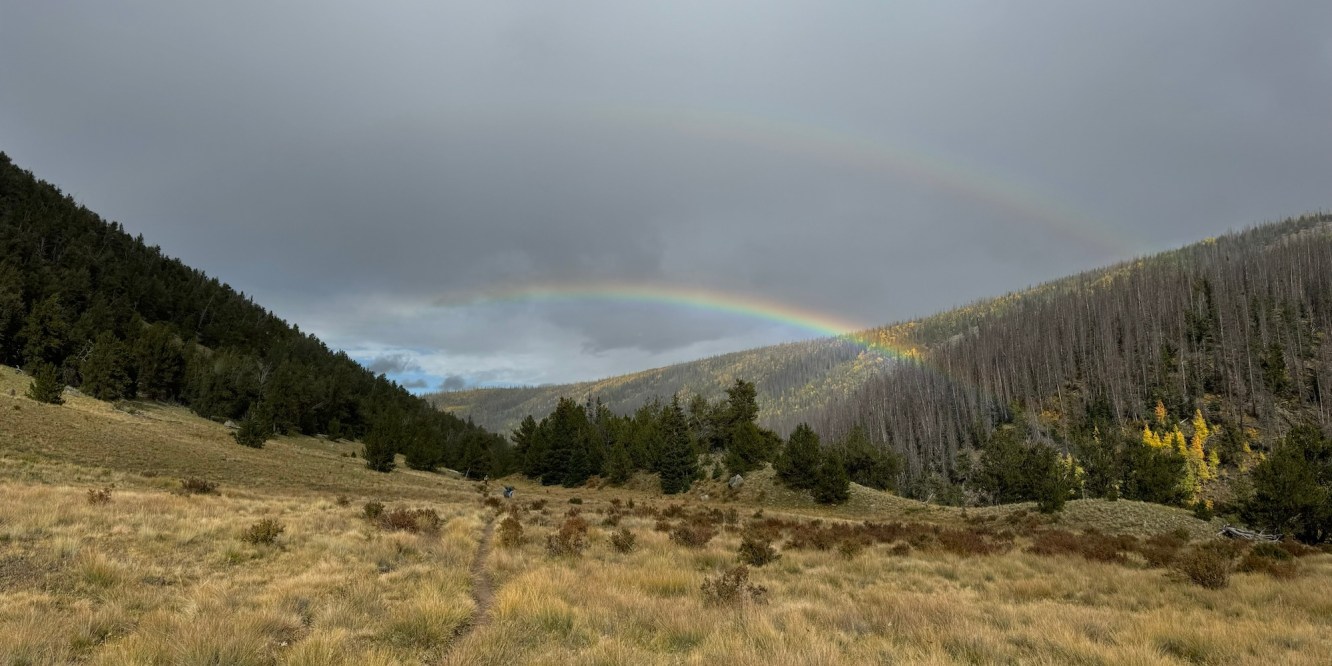 The rain came back and we eventually put back on our rain gear and continued. It was nonstop day of rain gear on and off again. Around 4:20 the rain had just lightened up and I turned around to Aster looking at the sky and a giant rainbow above her.