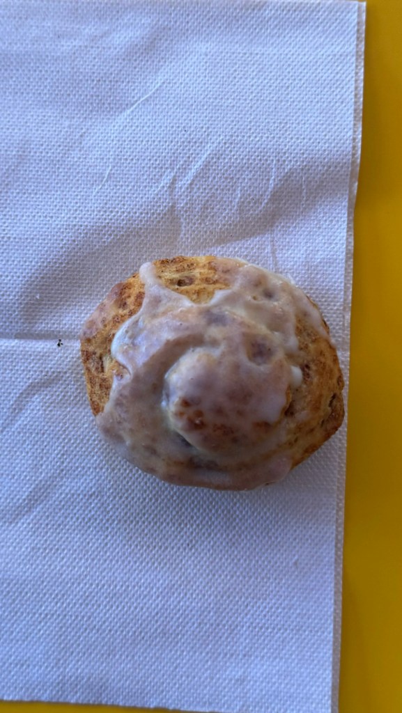 The cinnamon roll was delicious and probably a 9 out of 10. The frosting could have been a little bit less sweet, but overall it was just so yummy!