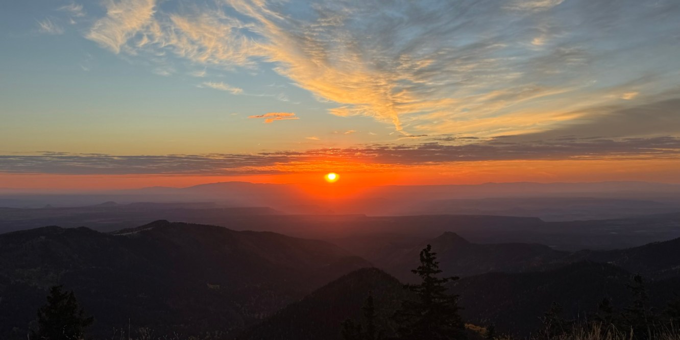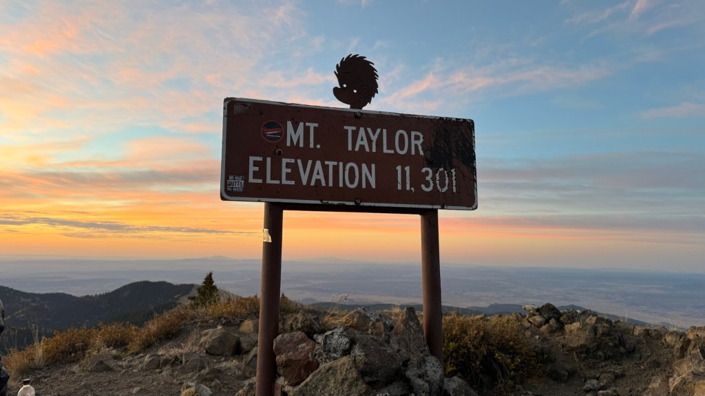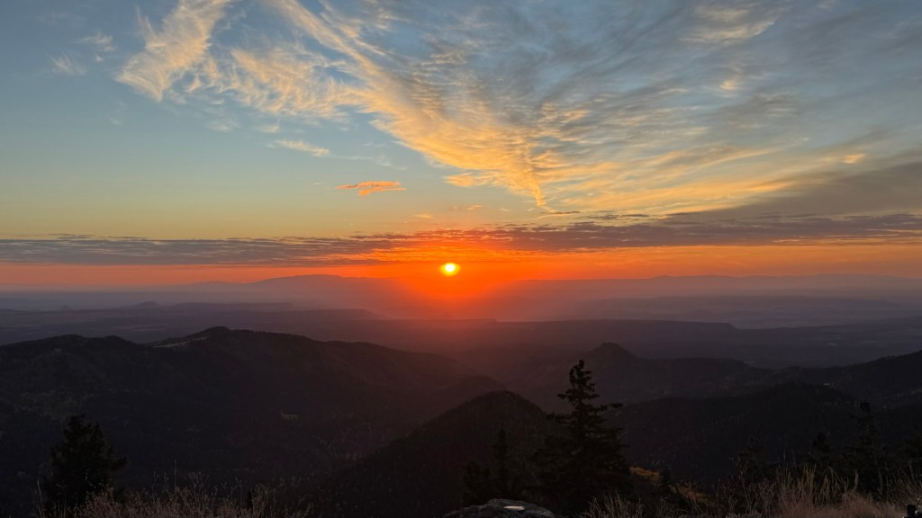 As we climbed up we saw the lights of Albuquerque in the distance and then eventually Grants on the other side. As we were nearing the top of Mount Taylor we saw the sky start to glow red as the sun was inching up.