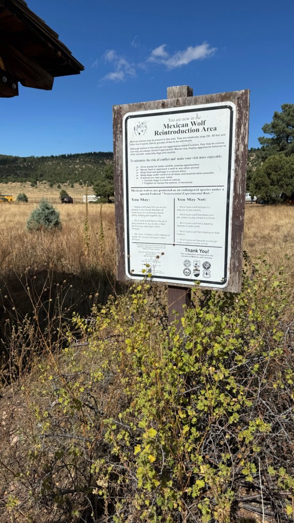 While at lunch, Whatever noticed this sign that said they had reintroduced Mexican wolves to this area. We both looked at each other and said “We knew it!” as Aster was dubious that it was wolves.
